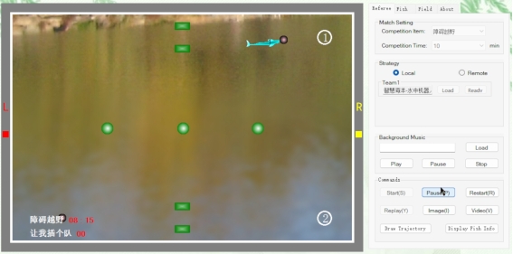 本次参赛的2D仿真障碍越野项目为10分钟限时排位赛,要求参赛队伍操控仿真鱼在标准场地内完成两阶段推球任务。第一阶段需绕过圆柱障碍,携带1号球通过方孔并推入1号洞;第二阶段返回起点后,绕过三个圆柱障碍,携带2号球通过方孔并推入2号洞。项目按任务完成情况计分,每完成一个阶段得5分,总分10分,未按规定绕行障碍或未通过方孔将相应扣分,总分相同时以进球耗时短者胜出。
