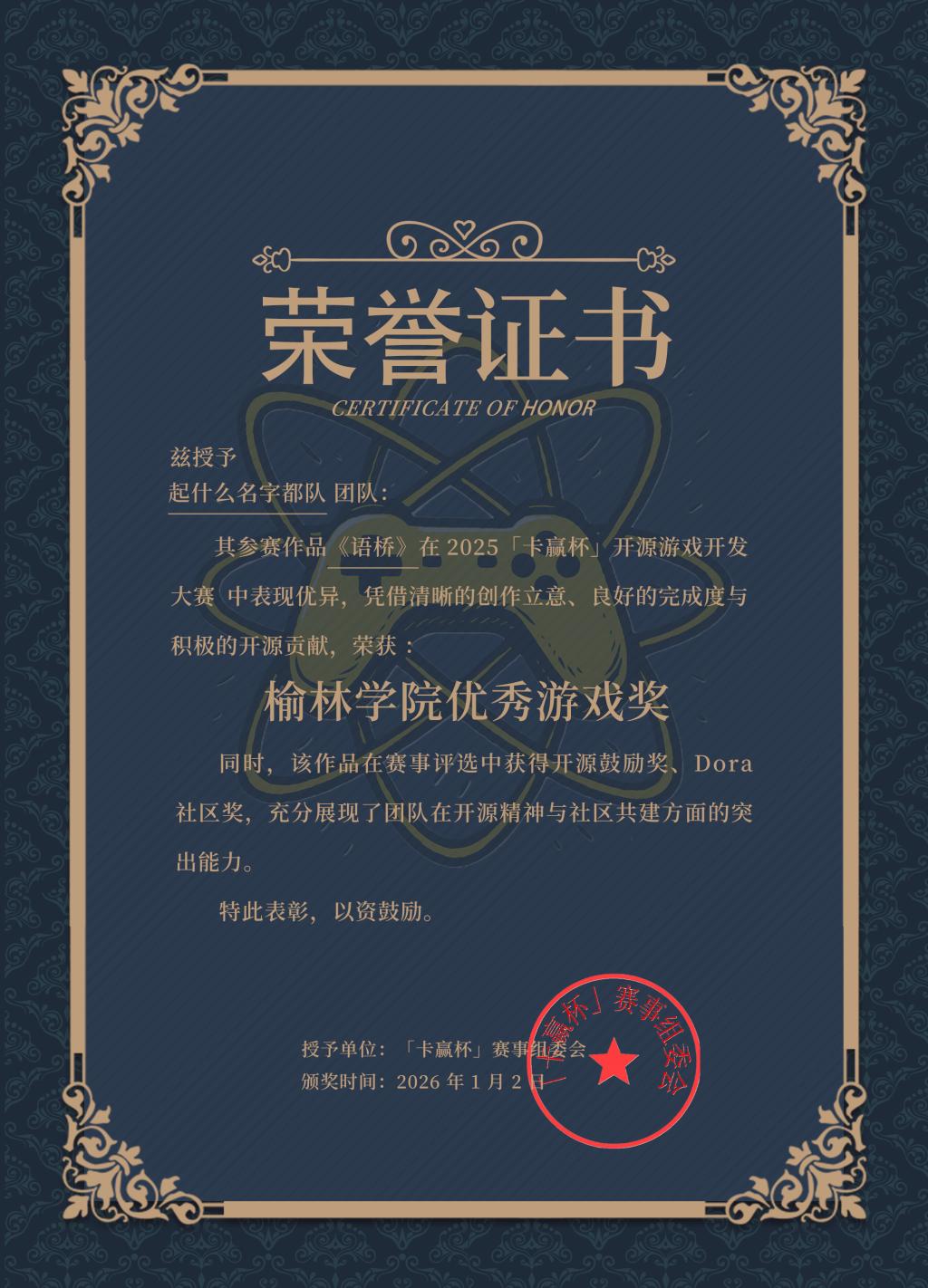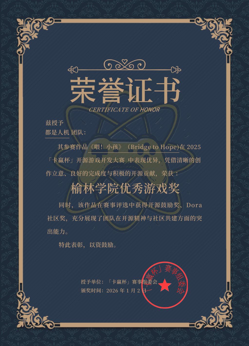 自11月22日发布命题,至12月7日为期16天的集中开发周期内,各参赛队伍迎难而上,最终65支队伍突破技术与创意难关,高质量完成了兼具技术与创意的游戏开发任务。我们学子创作的《喂!小孩》《语桥》《支点 Fulcrum》《桥之守护者》等作品凭借鲜明的公益主题、扎实的技术实现与动人的情感表达脱颖而出,成功入围并分别赢得458元至1158元不等的奖金。每一款作品从不同维度诠释了“桥”的深意:或是跨越内心恐惧的成长之桥,或是连接孤独与陪伴的情感之桥,亦或是揭露社会忽视、呼吁平等的认知之桥。