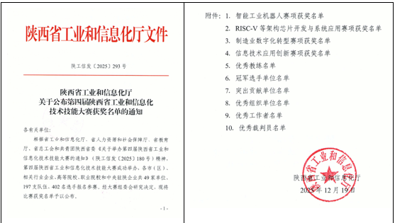 为培育支撑加快推进新型工业化建设、构建现代化产业体系的高素质技术技能人才,陕西省工业和信息化厅、省人力资源和社会保障厅、省教育厅、省总工会和共青团陕西省委共同举办了第四届陕西省工业和信息化技术技能大赛。该项大赛为省级一类职业技能大赛,设置了智能工业机器人、RISC-V等架构芯片开发与系统应用、制造业数字化转型、信息技术应用创新4个赛项,各赛项均分为职工组(含教师)和学生组两个竞赛组别。我们人工智能产业学院依托2025年获批的工业和信息化部“麒麟工坊”实训基地,积极组织师生参加信息技术应用创新赛项,共派出2支教师队伍和2支学生队伍参赛,取得了优异成绩。